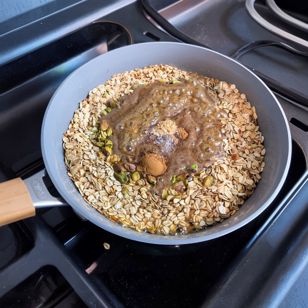 Once the oats are lightly golden, reduce the heat to low. Add all the remaining ingredients directly to the pan: the pistachios, pecan butter, maple syrup, ground flaxseed, cinnamon, ginger, and salt. Stir constantly, breaking up the nut butter, until everything is well combined and the mixture is fragrant and deeply golden brown. This will take another 5-10 minutes. The mixture will be sticky and appear soft—that’s exactly what you want.
