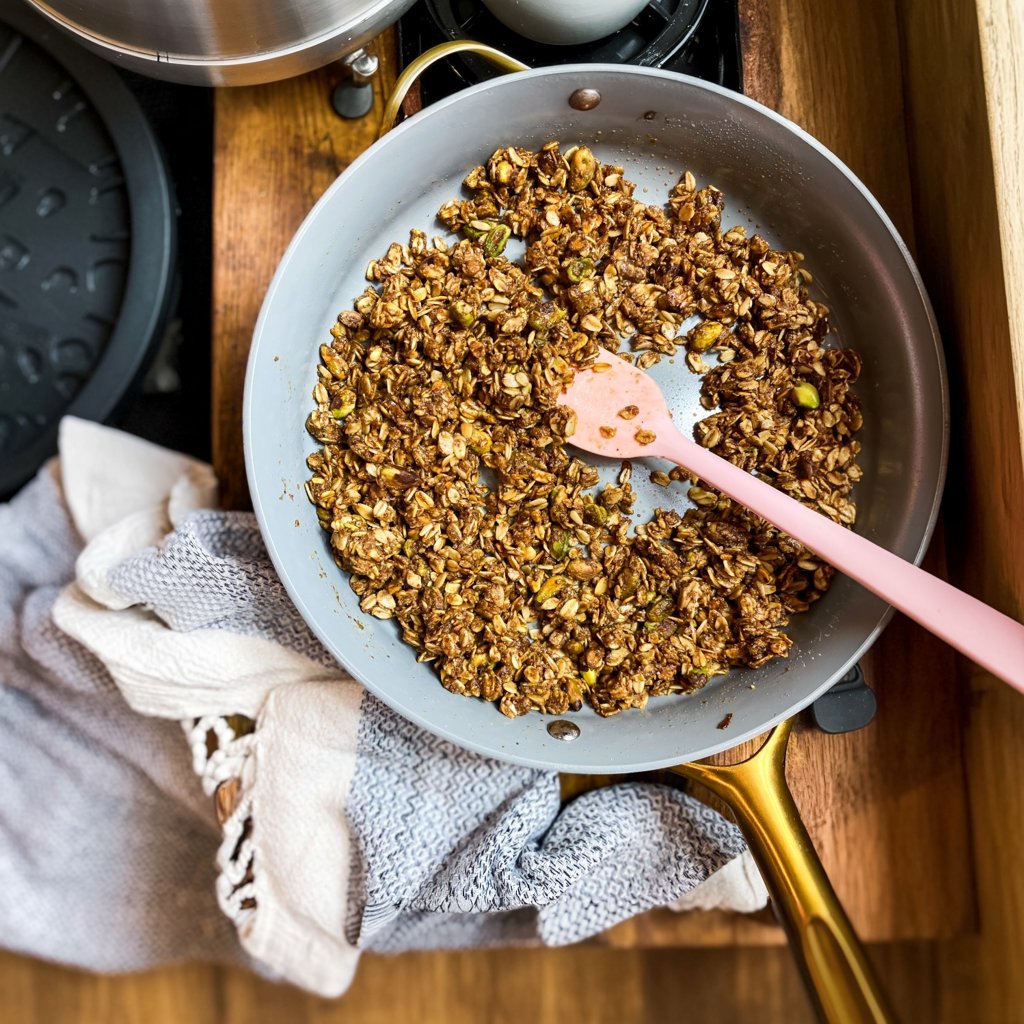 - Using a Small Pan: If you overcrowd the pan, the granola will steam instead of toast. This leads to a chewy, soggy result. Use a large skillet that allows the ingredients to be spread out.