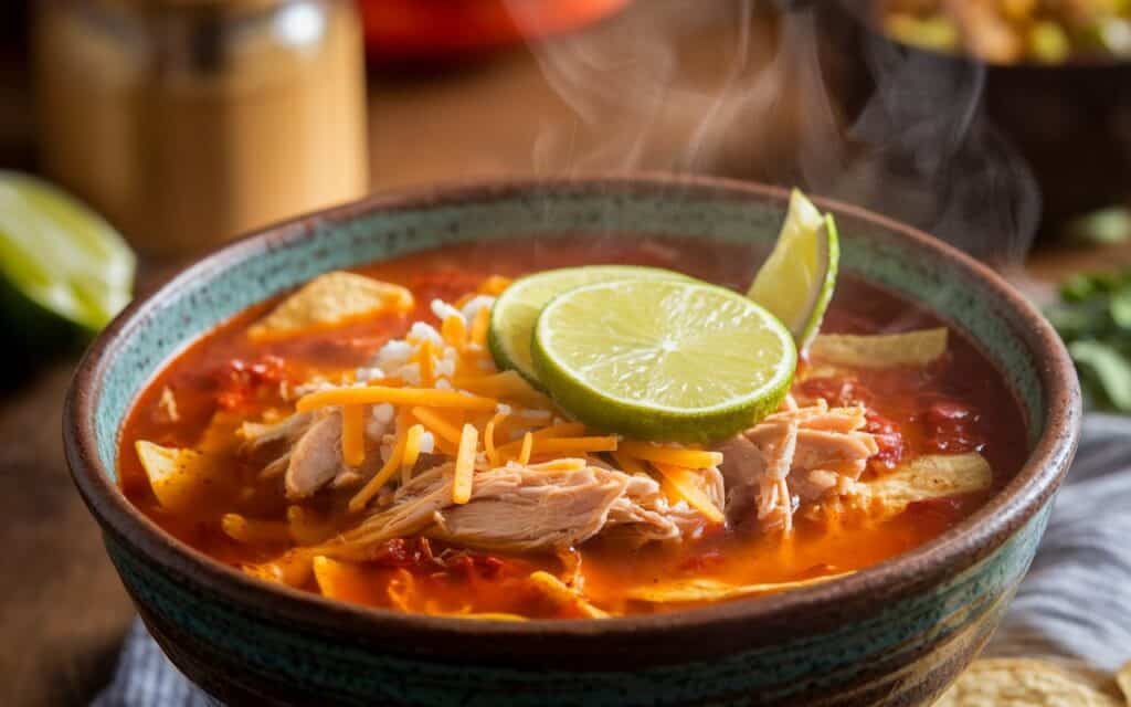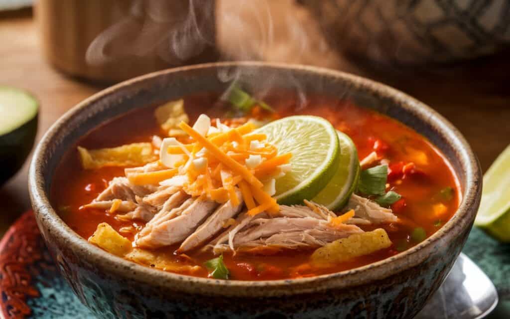 Ladle soup into bowls, top with crispy tortilla strips, diced avocado, shredded cheese, fresh cilantro, and a drizzle of sour cream if desired. A squeeze of fresh lime juice brightens the flavors even more.