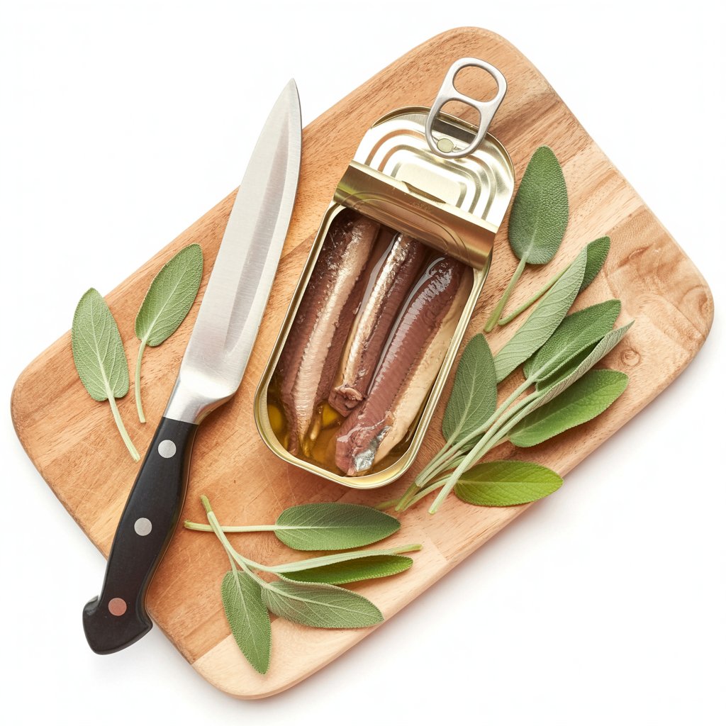 | Anchovy Fillets in Oil | 8 fillets | Drained. These will be wrapped in sage for little salt bombs. |