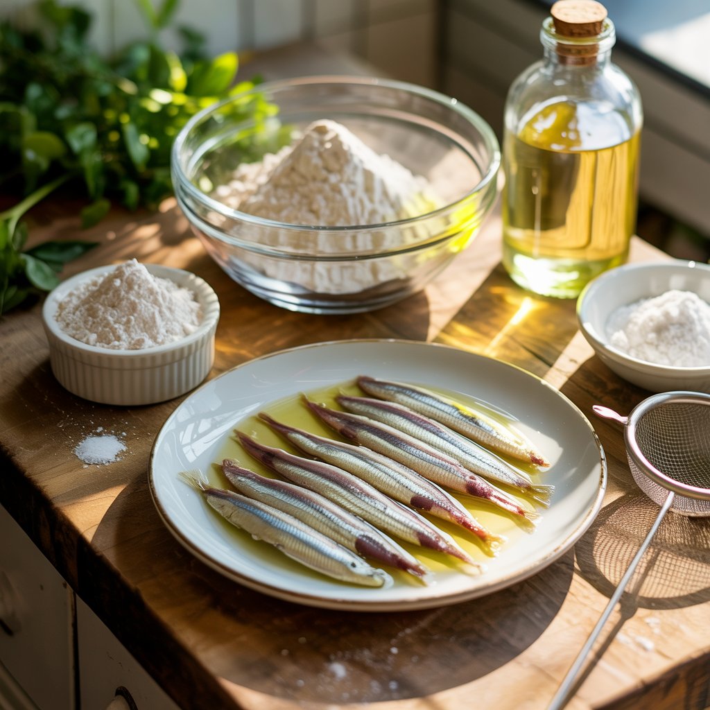 Prepare all your ingredients for frying. Pat the squid, prawns, and whitebait completely dry with paper towels—this is crucial for a crispy batter. For a truly special bite, wrap each anchovy fillet with a sage leaf. In a large bowl, lightly toss the fennel, squid, prawns, and whitebait in a dusting of plain flour, shaking off any excess. This light coating helps the batter adhere beautifully.
