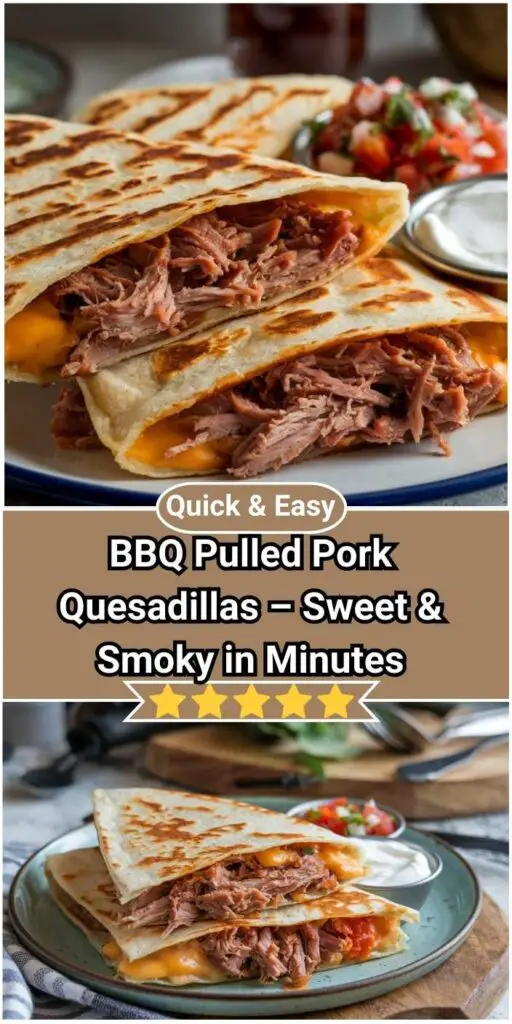 BBQ Pulled Pork Quesadillas – Sweet & Smoky in Minutes prove that leftover (or store-bought) pulled pork can transform into a sizzling new dish with minimal extra fuss. By layering tangy-sweet BBQ sauce, tender pork, and a generous portion of cheese between tortillas, you quickly create a gooey, crispy meal that merges southwestern comfort with classic barbecue notes. The entire process demands only a skillet, some basic flipping skills, and about 15 minutes—perfect for impromptu lunches, dinners, or a party-friendly appetizer.