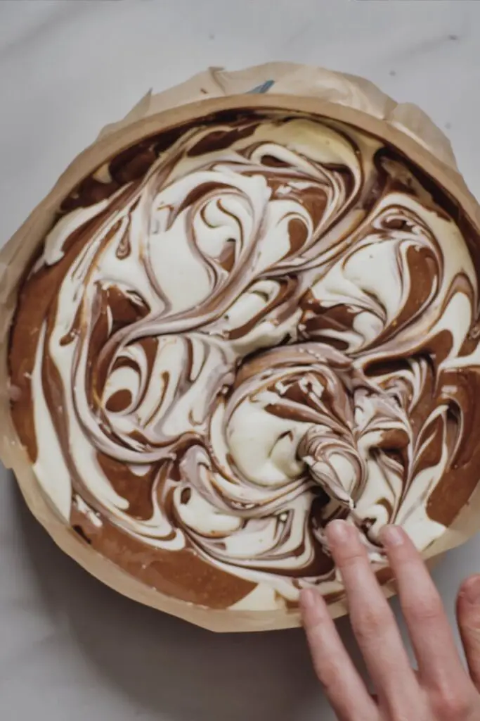 Take a butter knife or a skewer and plunge it down into the batter, all the way to the crust (but try not to break the crust!). Make 3-4 parallel “swirls” through the batter in one direction (e.g., north to south). Then, repeat the process in the other direction (e.g., east to west). One or two final figure-eights can be nice, but do not over-swirl, or you’ll just end up with a plain chocolate cheesecake!