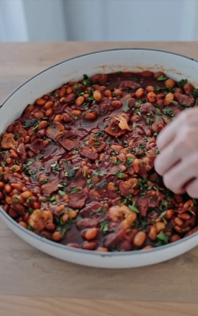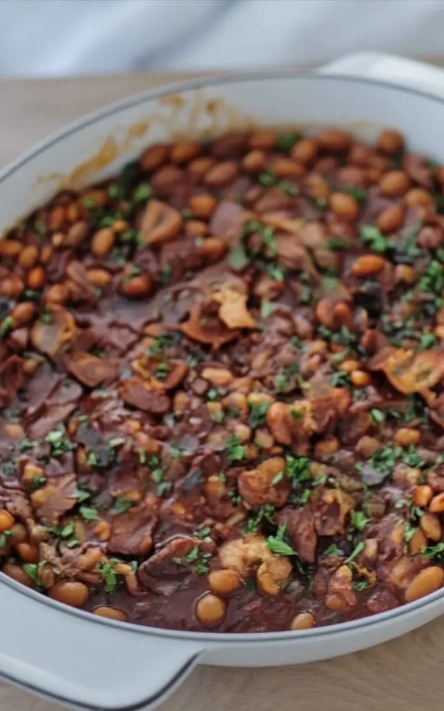 Your amazing homemade baked beans are ready! Serve them hot, garnished with the remaining crispy bacon and, if you like, some freshly chopped parsley or chives for a pop of colour.