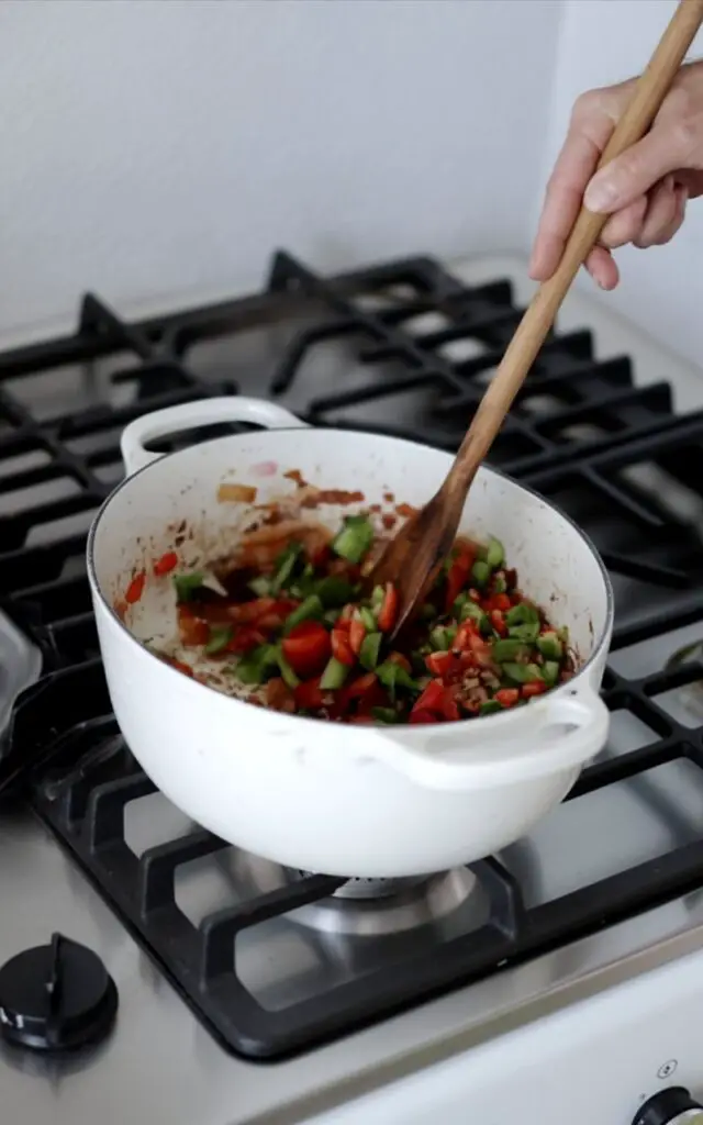Once the onions are well browned and sweet, add the minced garlic and diced bell peppers to the pot. Increase the heat to low-medium and cook for another 6-8 minutes, stirring occasionally, until the peppers have softened and the garlic is fragrant.