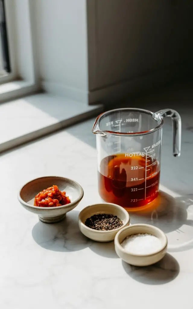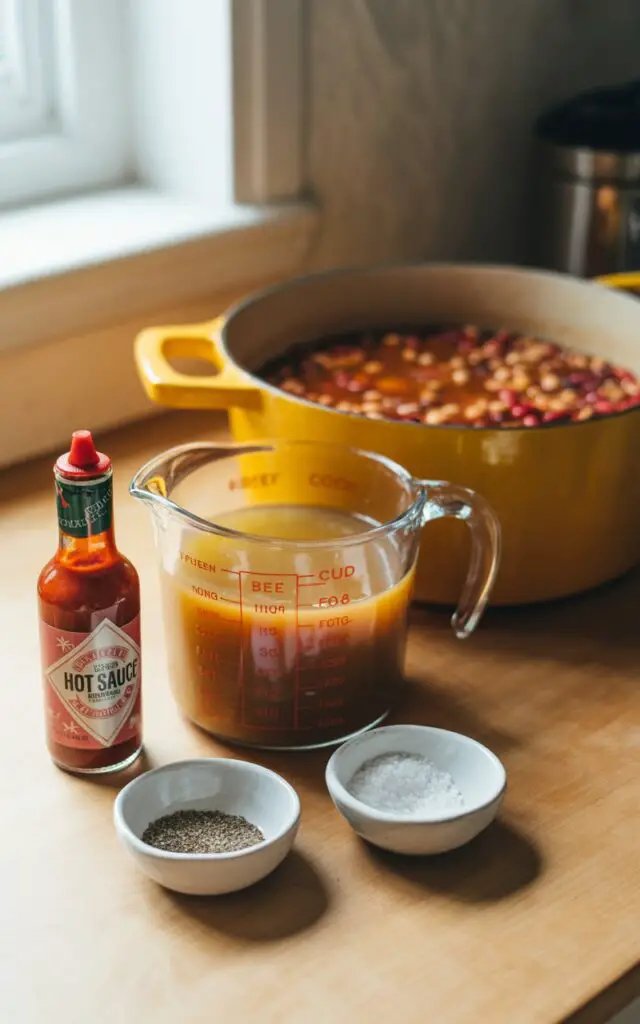 Now it’s time to build that glorious sauce. Add all the remaining ingredients to the pot: the soaked and rinsed beans, tomato puree, yellow mustard, tomato paste, apple cider vinegar, molasses, brown sugar, a dash of hot sauce, and 3 cups of beef stock. Stir in about three-quarters of the crispy bacon you set aside earlier. Season with salt and pepper, and mix until everything is completely combined.