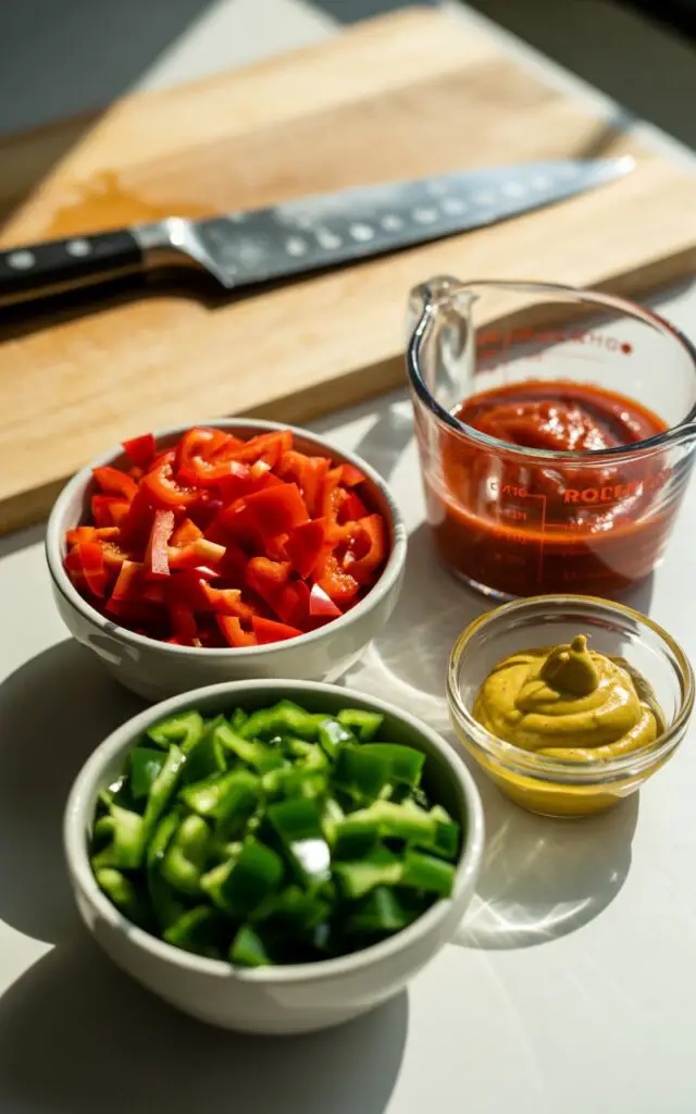 - Sauté aromatics: Add minced garlic and diced red & green bell peppers. Cook 6–8 minutes over low-medium heat until peppers soften and garlic is fragrant.