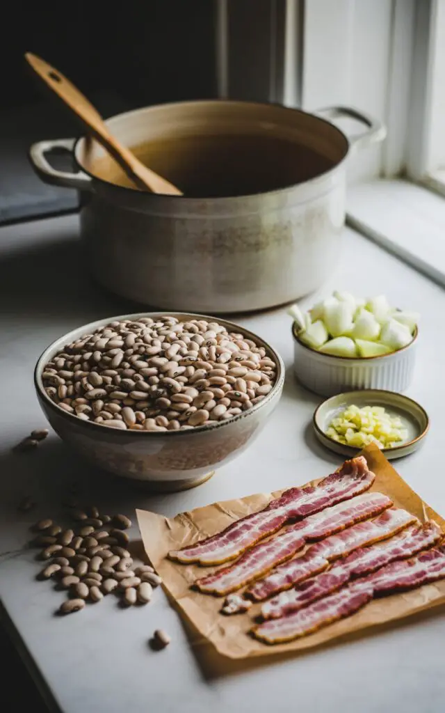 - Soak the beans (overnight): Place rinsed navy beans in a large bowl and cover with cool water by at least 4 inches. Soak 8–12 hours. Drain and rinse.
