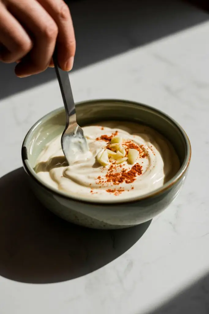 - Make the dressing: Whisk together sour cream, mayonnaise, minced garlic, and paprika until smooth. For extra tang, add a squeeze of lime.