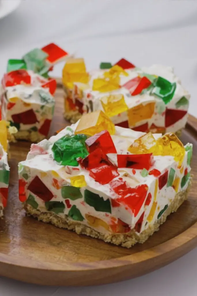 - Top: Sprinkle the remaining 1/3 of the gelatin cubes over the top of the dessert for a beautiful “stained glass” finish.