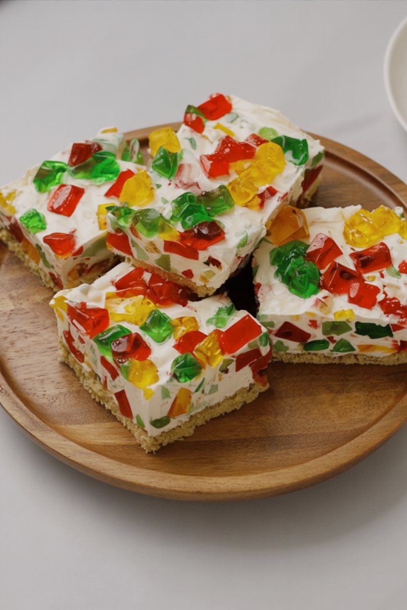 - Top: Sprinkle the remaining 1/3 of the gelatin cubes over the top of the dessert for a beautiful “stained glass” finish.
