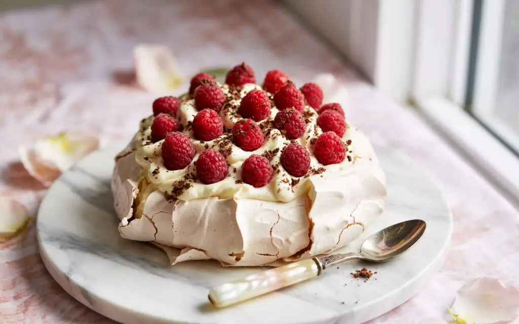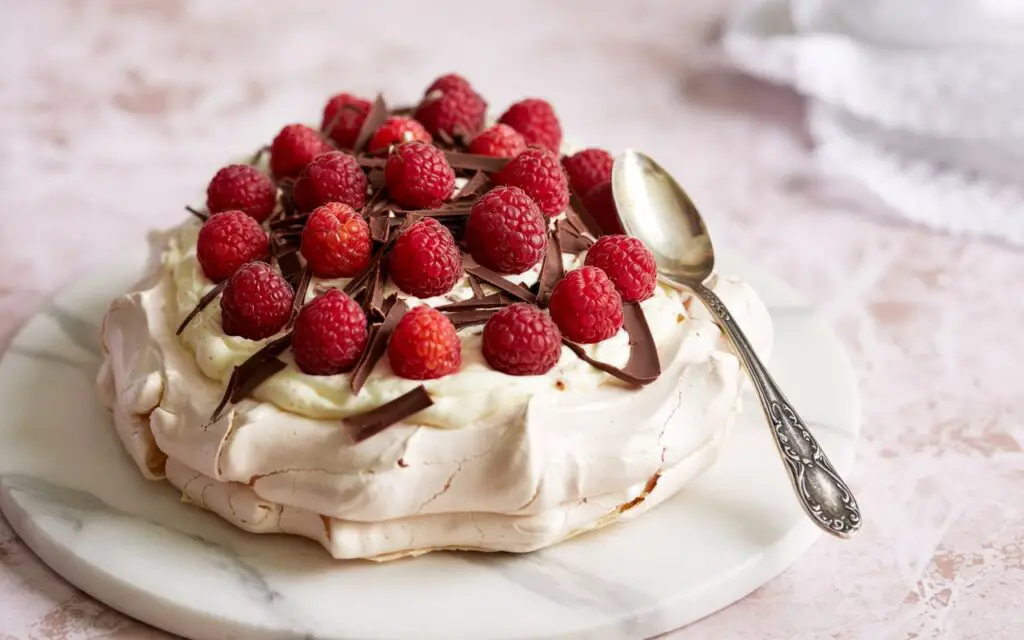 Omit cocoa and make a classic vanilla Pavlova topped with chocolate curls and raspberries.