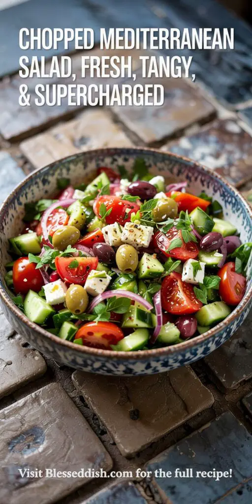 This Chopped Mediterranean Salad is a celebration of fresh produce and simple flavors, perfect for quick lunches, colorful sides, and effortless entertaining. Ready to brighten your mealtime? Head over to BlessedDish.com for more wholesome, global recipes that fit any occasion. If you try this salad, please leave a ★★★★★ review, share your vibrant photos on Instagram with #BlessedDish, and subscribe for weekly recipe inspiration delivered straight to your inbox. Enjoy your Mediterranean escape—no passport required!