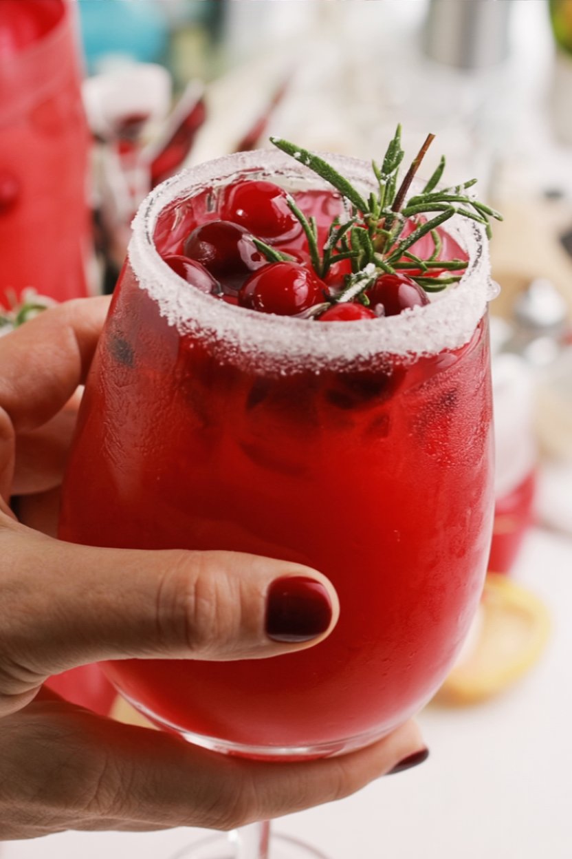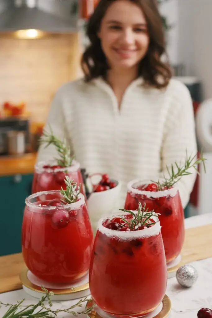 - Garnish and Serve: Garnish the pitcher or individual glasses with fresh cranberries and rosemary sprigs to mimic the look of mistletoe. Serve immediately in salt or sugar-rimmed glasses.