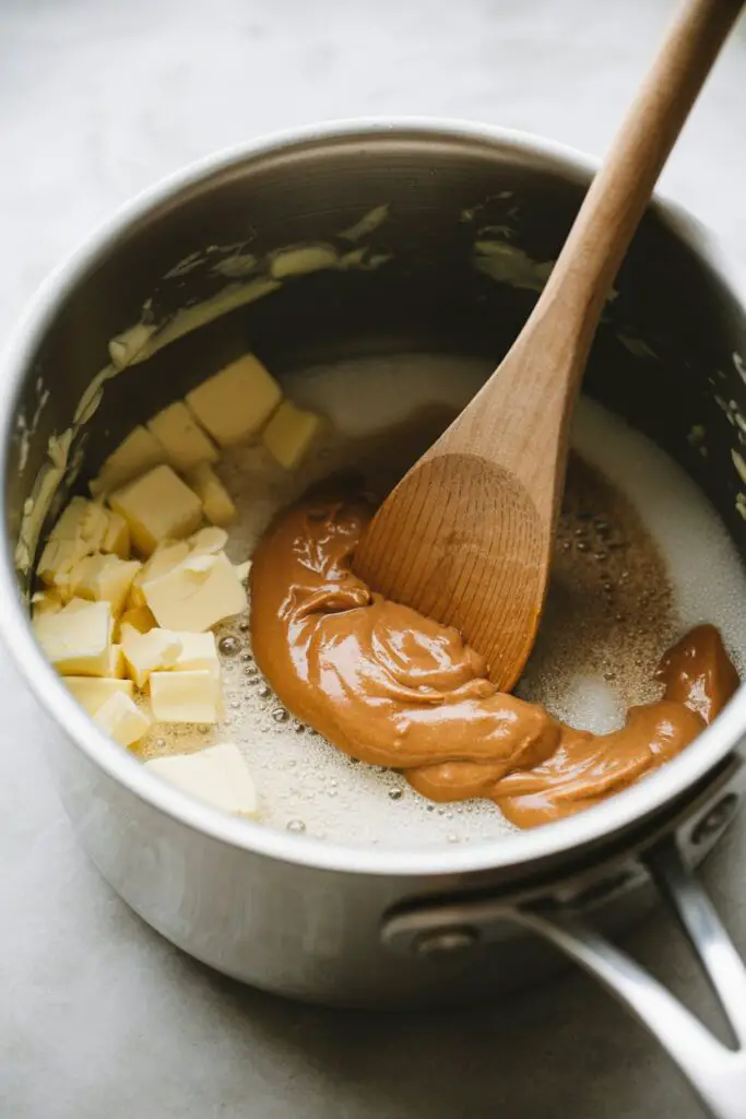 - Emulsify the flavors: Immediately stir in vanilla and peanut butter until glossy and smooth.