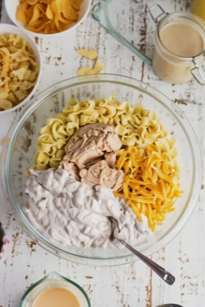 - Add the Topping: Sprinkle the remaining 1 cup of shredded cheddar cheese evenly over the top of the noodle mixture. Sprinkle the crushed potato chips all over the cheese.