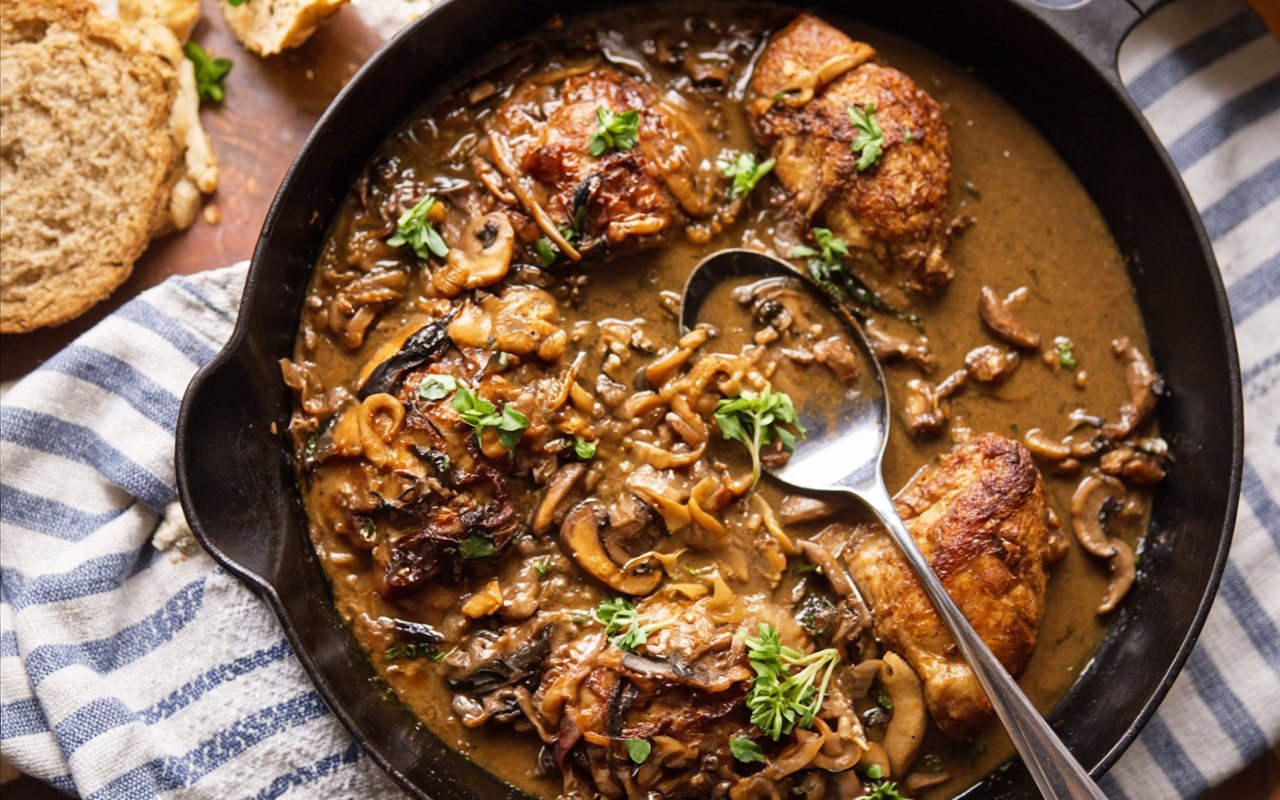This recipe builds layers of flavour using simple, rustic ingredients. The sweetness of the cider and onions plays beautifully against the savory herbs and tender chicken.
