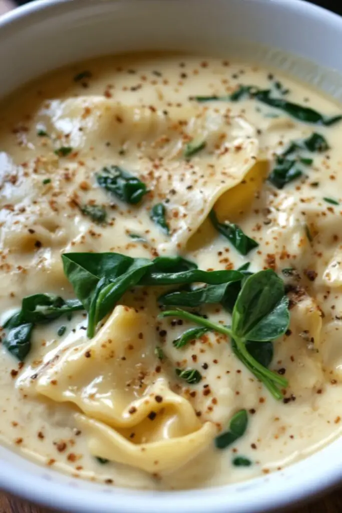 Add the fresh spinach to the pot. Stir for just a minute or two until the spinach has wilted into the soup. The residual heat is all you need. Ladle the hot Alfredo Lasagna Soup into bowls. For the full lasagna experience, top each serving with a generous dollop of ricotta cheese and a sprinkle of fresh parsley.