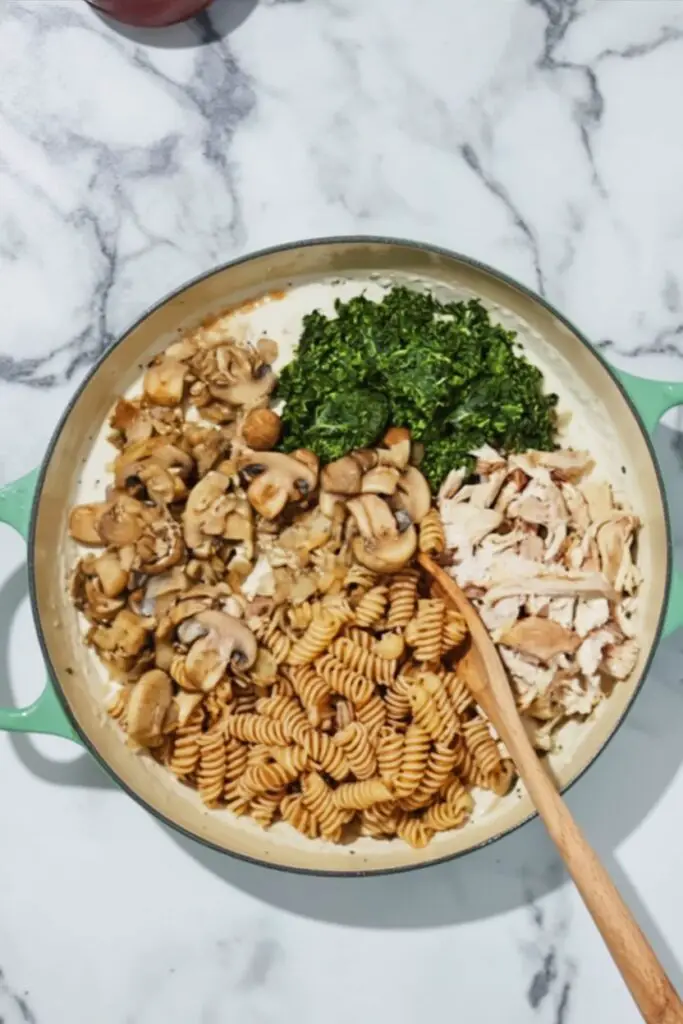 - Season & combine: Off heat, whisk in 1/2 cup Parmesan, remaining 1/4 tsp salt and 1/4 tsp pepper. Stir in pasta, chicken, squeezed-dry spinach, and the onion-mushroom mixture until coated.