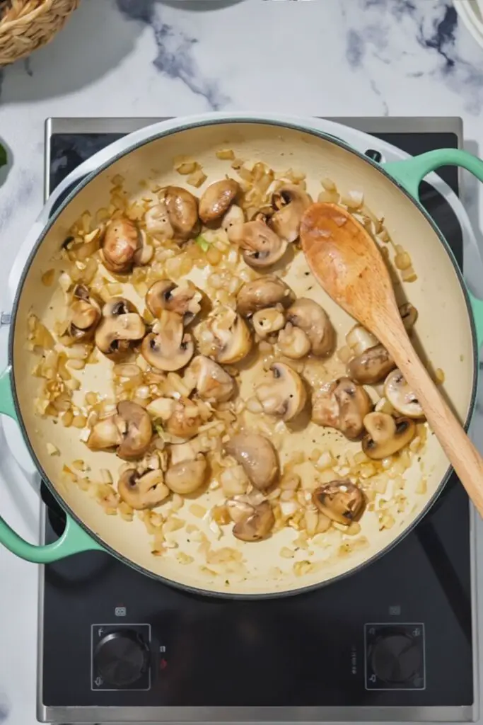 - Sauté vegetables: Heat 2 tbsp olive oil in an ovenproof skillet over medium heat. Cook onion 2 minutes. Add mushrooms, 1/4 tsp salt and 1/4 tsp pepper; cook 4–6 minutes until tender. Stir in garlic for 1 minute. Transfer mixture to a bowl.