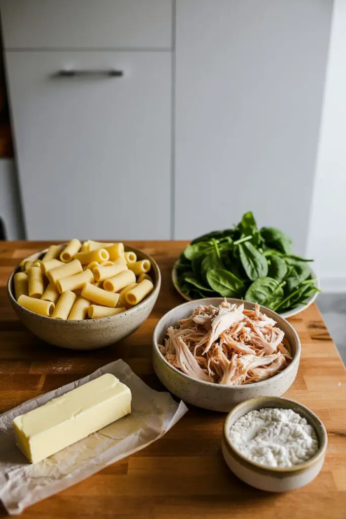 - Cook Pasta: Boil rigatoni in salted water until just under al dente. Drain and add to baking dish with shredded chicken and spinach; the pasta’s heat will wilt the greens slightly.