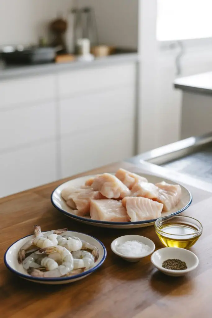 Start by ensuring your seafood is ready for the heat. Pat the cod fillets and shrimp dry with a paper towel; removing excess moisture ensures a golden sear rather than steaming the fish. Season them generously with salt and black pepper.