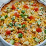 - Assemble: Arrange the chicken in a single layer over the creamy base. Scatter the diced tomatoes and corn on top. Dollop and spread the remaining creamy mixture over everything, then sprinkle with shredded cheese.