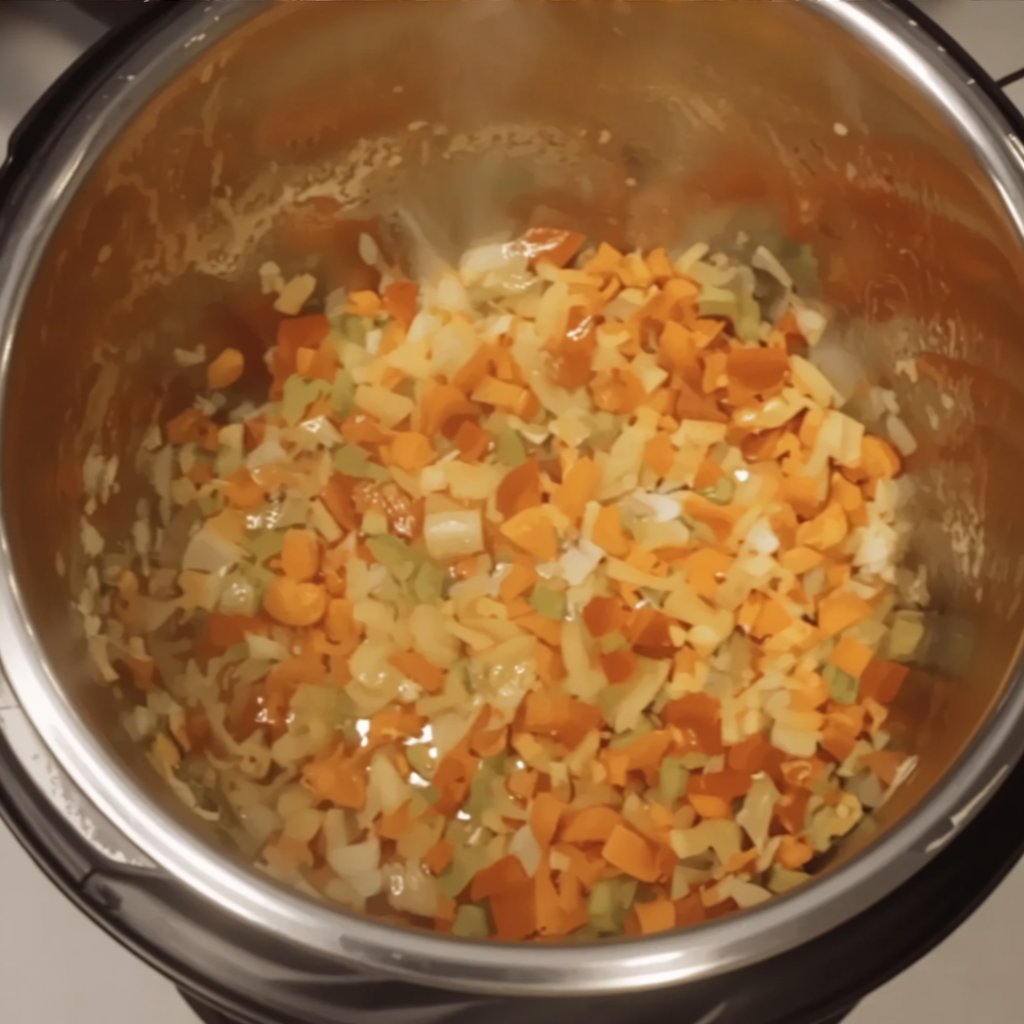 - Sauté Aromatics: Set the Instant Pot to “Sauté” on high. Add butter. Once melted, add the onion, bell pepper, celery, and carrot. Sauté for 3 minutes until softened.