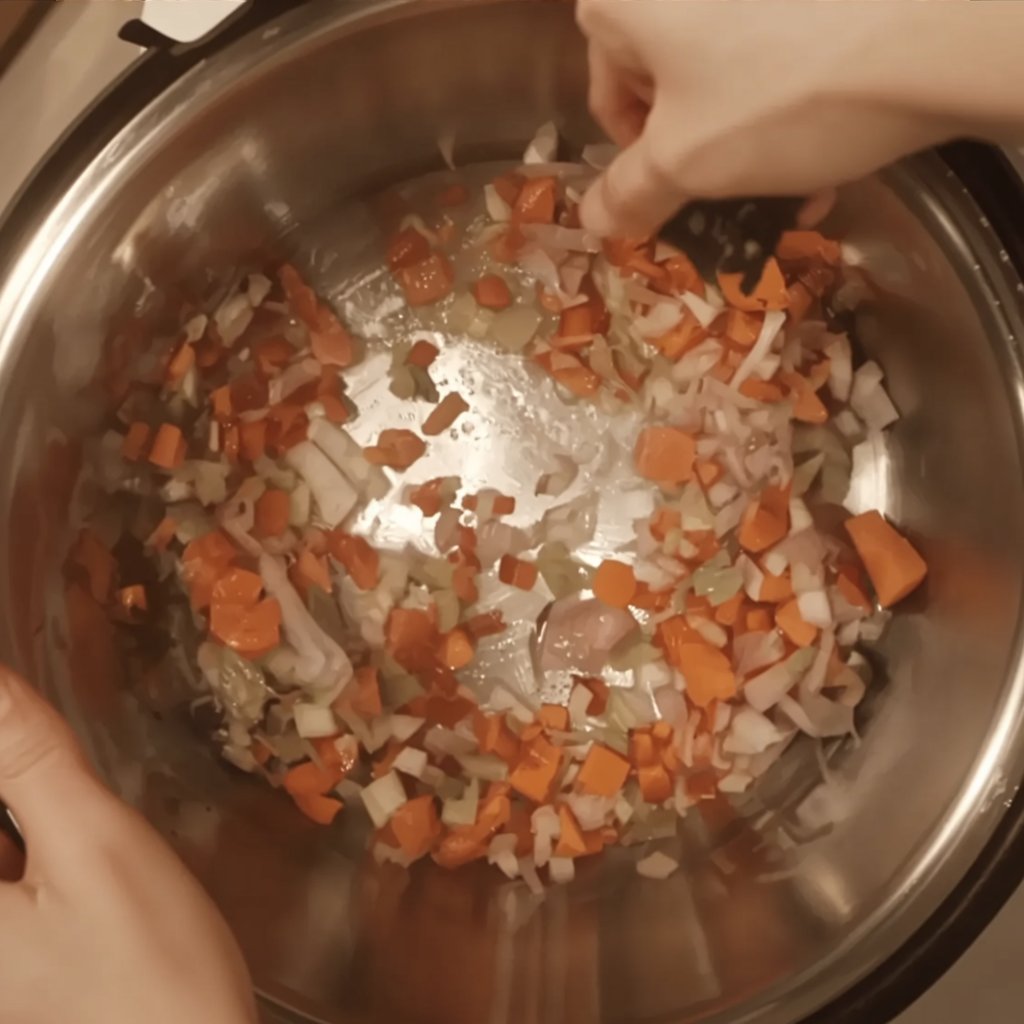 Press the “Sauté” button on your Instant Pot and adjust it to the “More” or “High” setting. Add the butter to the pot. Once it’s melted and shimmering, add the diced onion, bell pepper, celery, and carrot. Sauté for 3 minutes, stirring occasionally, until the vegetables begin to soften.
