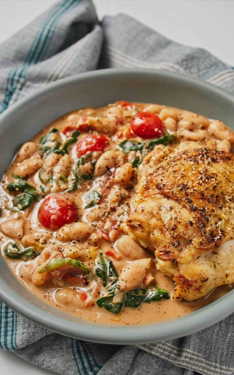 - Serve: Taste and adjust salt and pepper if needed. Spoon the creamy bean stew onto plates and top with the chicken thighs.
