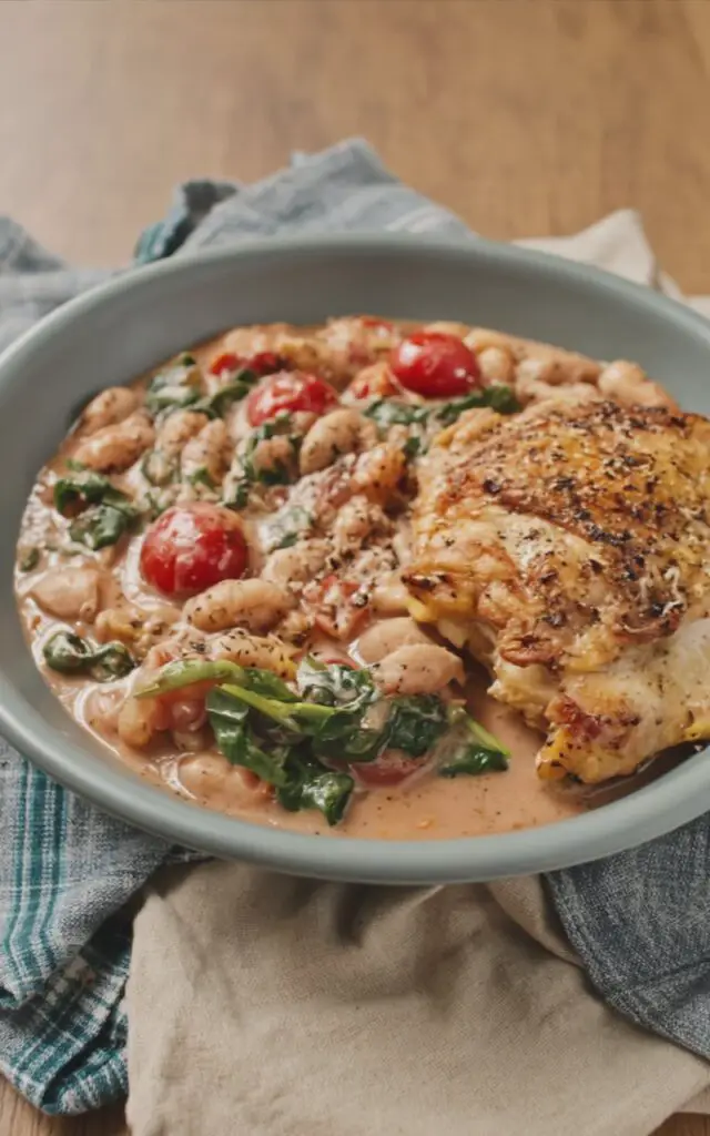 - Braise the chicken: Nestle chicken, skin‑side up, into the bean‑tomato mixture (add any plate juices). Bring to a gentle simmer, cover, and cook on low‑medium 25–30 minutes, until an instant‑read thermometer at the bone reads 165°F/74°C.