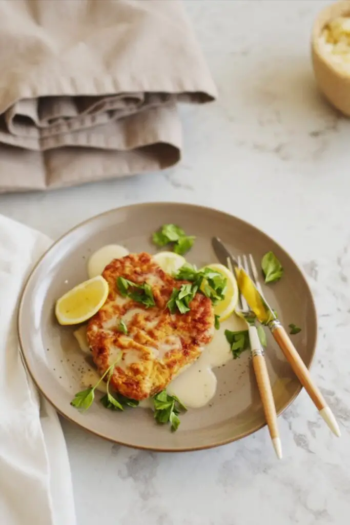 - Actionable Tip: Swirling the pan with the butter off the heat is the secret to a creamy sauce that doesn’t “break” or separate.Discard the lemon halves from the sauce. To serve, place one crispy chicken breast on each plate. Spoon the warm lemon butter sauce generously over the top. Garnish with a fresh slice of lemon and a sprinkle of chopped parsley. Serve immediately!