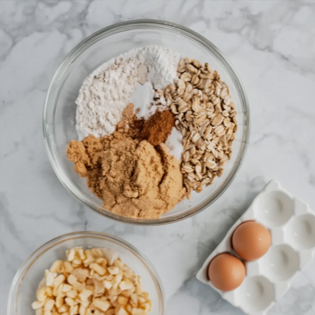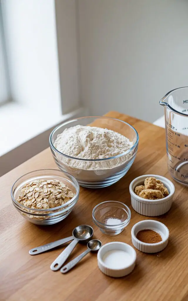 - Dry ingredients: In a large bowl whisk flour, oats, brown sugar, cinnamon, baking powder, baking soda, and salt until evenly combined.