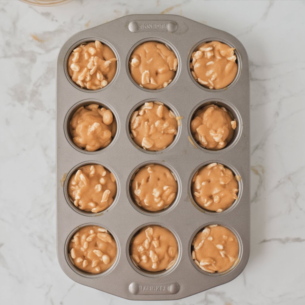 - Combine & fold in apples: Make a well in the dry mix, pour in wet, and stir just until combined (a few lumps are fine). Fold in chopped apple; divide batter among cups.