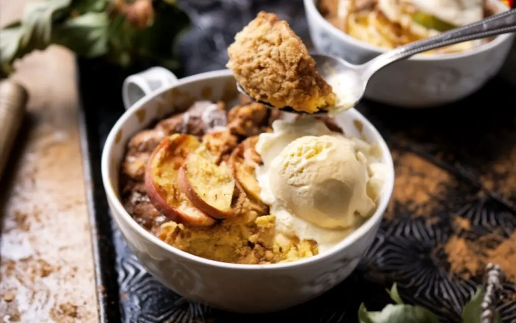 This is the ultimate quick-fix dessert that satisfies a craving almost instantly! This recipe uses simple pantry staples to create a delicious single-serving dessert, from the softened apples at the bottom to the buttery, spiced topping.