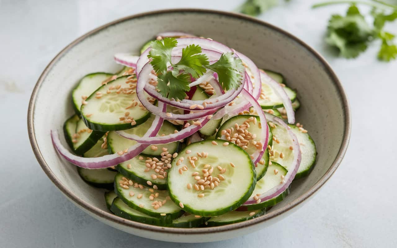 This vibrant, crisp cucumber salad features thinly sliced cucumbers tossed in a tangy, lightly sweet Asian-inspired dressing. Enhanced with garlic, ginger, and a touch of chili, the salad is finished with a sprinkle of sesame seeds and fresh scallions for an extra burst of flavor. Perfect as a light side dish or a healthy snack, it’s quick to prepare and refreshingly delicious.