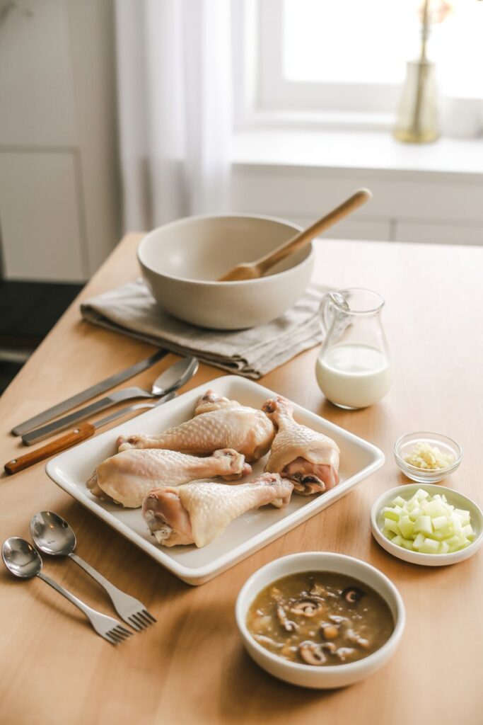 If your skillet is oven-safe, you can proceed in it. If not, transfer the sautéed onions and garlic to a baking dish large enough to hold the chicken in a single layer (a 9×9 or similar size works well). Place the seared chicken legs on top of the onion and garlic mixture. Pour the prepared cream of mushroom soup and milk mixture evenly over the chicken pieces.