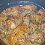 If your skillet is oven-safe, you can proceed in it. If not, transfer the sautéed onions and garlic to a baking dish large enough to hold the chicken in a single layer (a 9×9 or similar size works well). Place the seared chicken legs on top of the onion and garlic mixture. Pour the prepared cream of mushroom soup and milk mixture evenly over the chicken pieces.