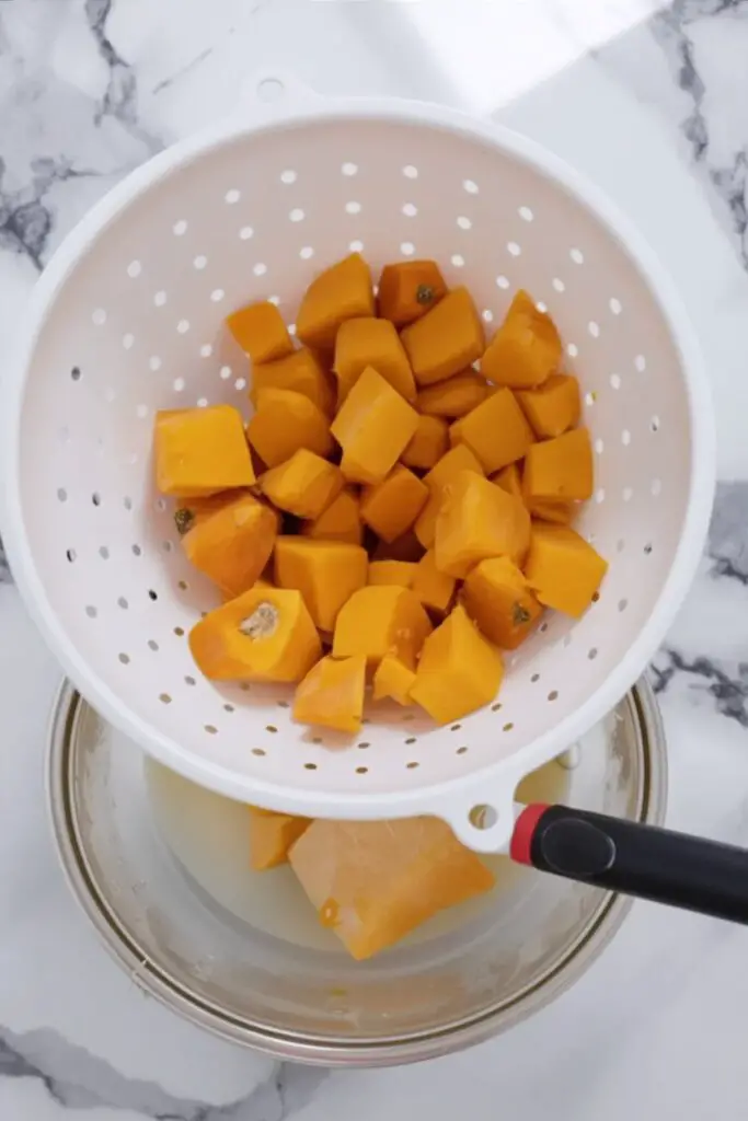 - Mix the Sweet Potato Filling: Transfer the hot, drained sweet potatoes to a medium bowl. Mash with a fork or potato masher until mostly smooth.