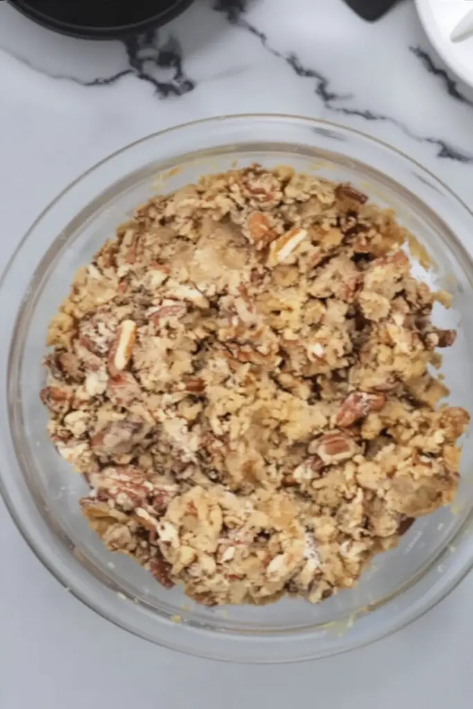 In a separate bowl, it’s time to make that irresistible crunchy layer. Add the chopped pecans, packed brown sugar, all-purpose flour, and melted butter. Stir with a fork until the mixture is combined and crumbly, like wet sand.