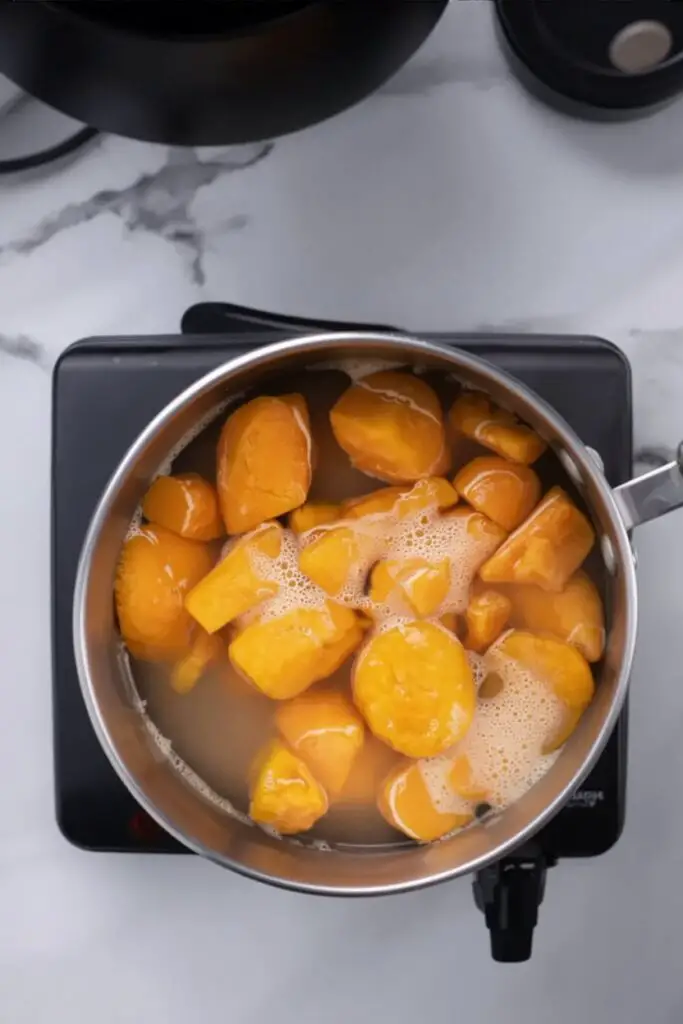 - Heat and Drain Sweet Potatoes: Place the entire contents of the canned sweet potatoes (including the liquid) into a medium saucepan. Bring the mixture to a boil over medium-high heat.