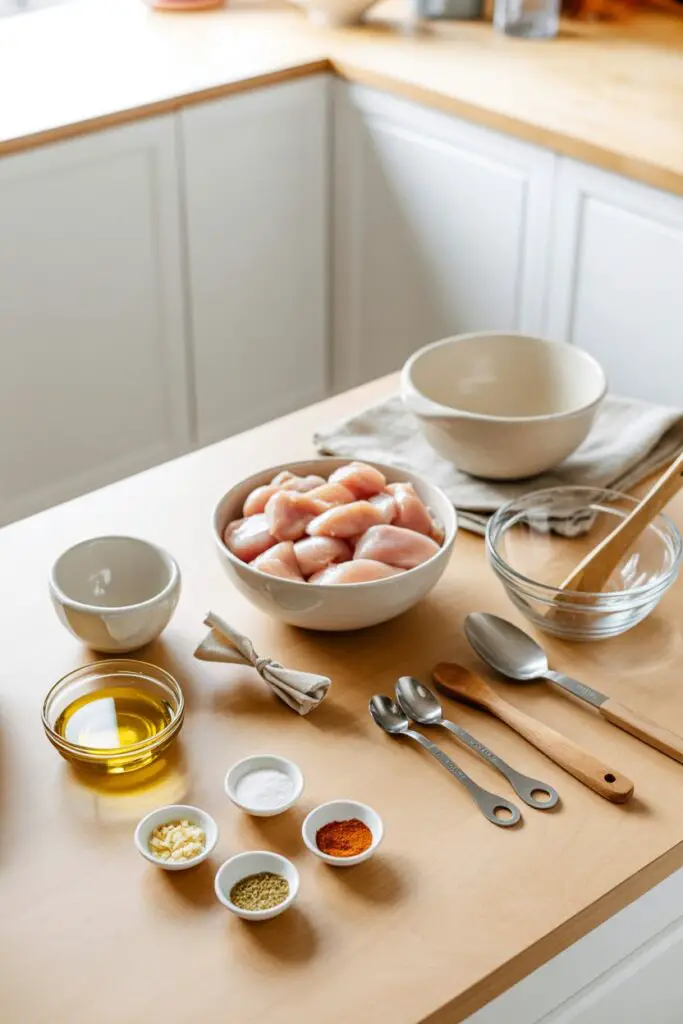 Begin by dicing the chicken breasts into small, bite-sized pieces (about ½ to ¾ inch). Place the diced chicken in a large bowl. Drizzle with the olive oil, then sprinkle evenly with the garlic powder, onion powder, paprika, salt, and pepper. Toss everything together until the chicken pieces are thoroughly coated in the spices.