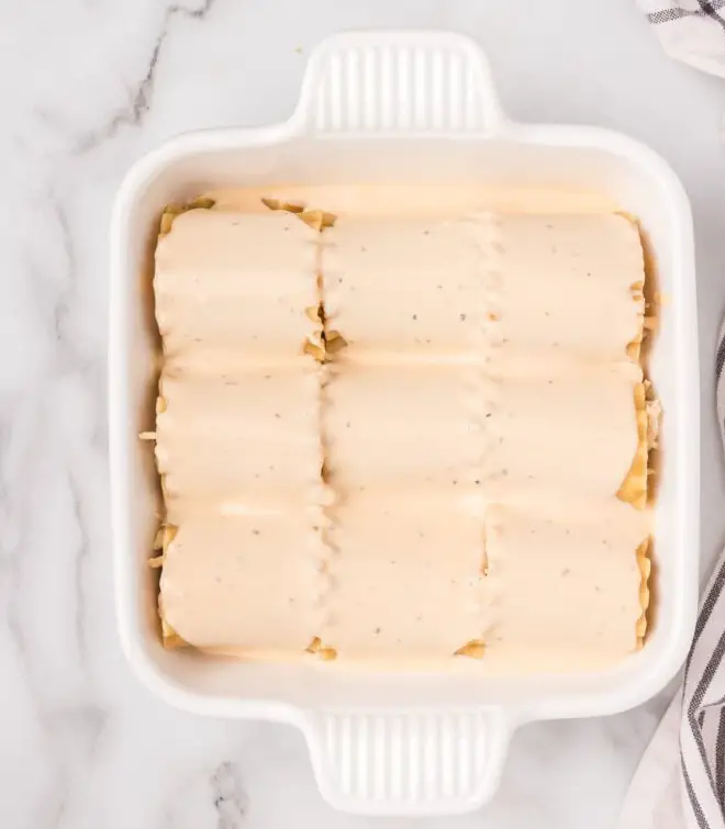Absolutely! A homemade garlic Alfredo sauce would be fantastic here. You’ll need about 1 ½ to 2 cups of sauce total – enough to mix 1 cup with the filling and use the rest for the bottom and top of the pan.