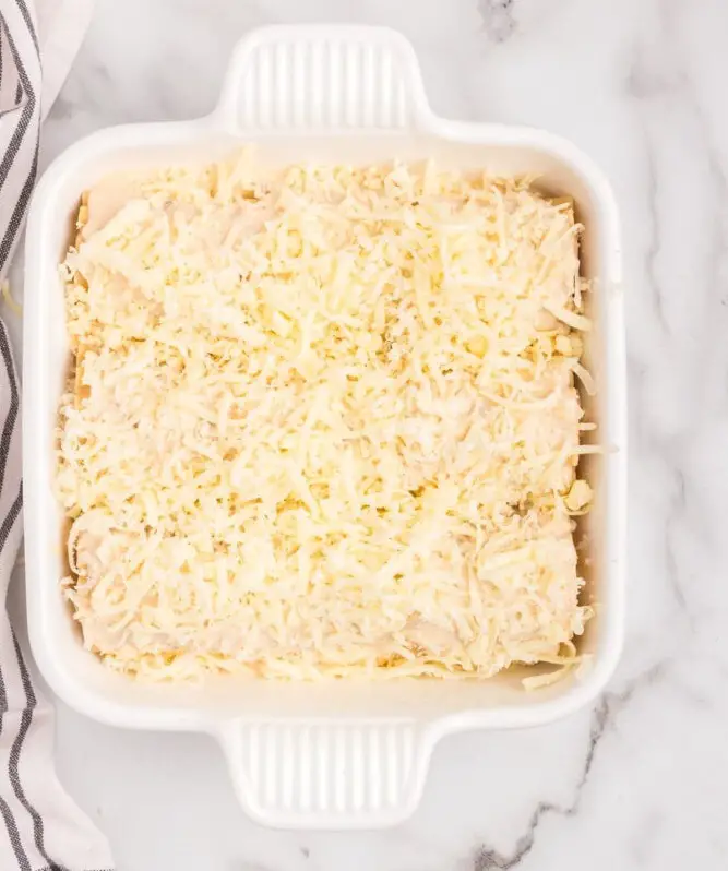 First, preheat your oven to 350°F (175°C). Generously spray an 8×8 inch square baking pan with non-stick cooking spray. Pour ½ cup of the Alfredo sauce into the bottom of the pan and spread it evenly to create a base. Set the pan aside.