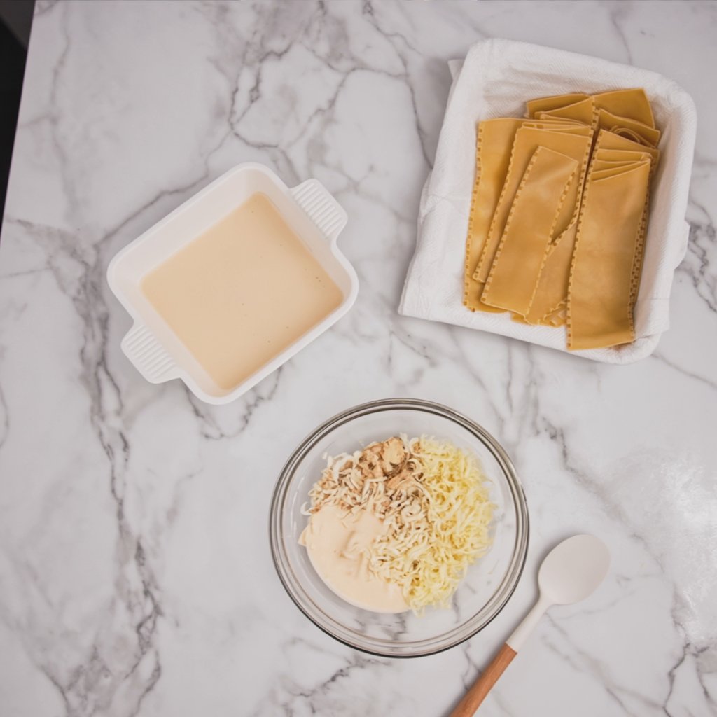 - Preheat & Prep Pan: Preheat oven to 350°F (175°C). Spray an 8×8 inch square baking pan. Pour ½ cup of the Alfredo sauce into the bottom and spread evenly.