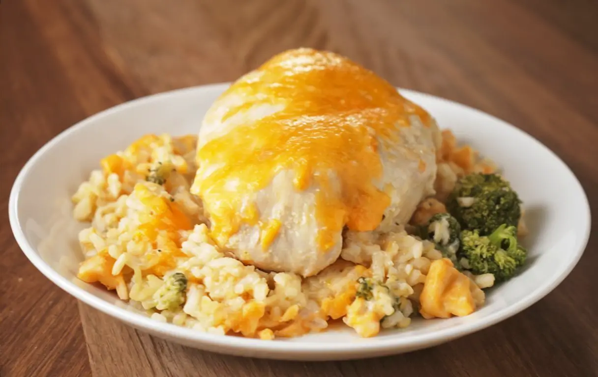 Build the Casserole Base: In the casserole dish, combine the uncooked long-grain rice, black pepper, onion powder, cream of chicken soup, 1 cup of cheddar cheese, diced broccoli, and the chicken broth. Mix these ingredients thoroughly right in the dish.