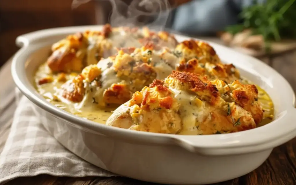 This classic Chicken and Stuffing Bake is the hero of busy weeknights. It’s a nostalgic and beloved casserole that combines tender, juicy chicken breasts, a savory cream sauce, and a perfectly golden, crunchy stuffing topping. Using just four simple pantry staples, you can assemble a hearty and satisfying dinner that practically cooks itself.