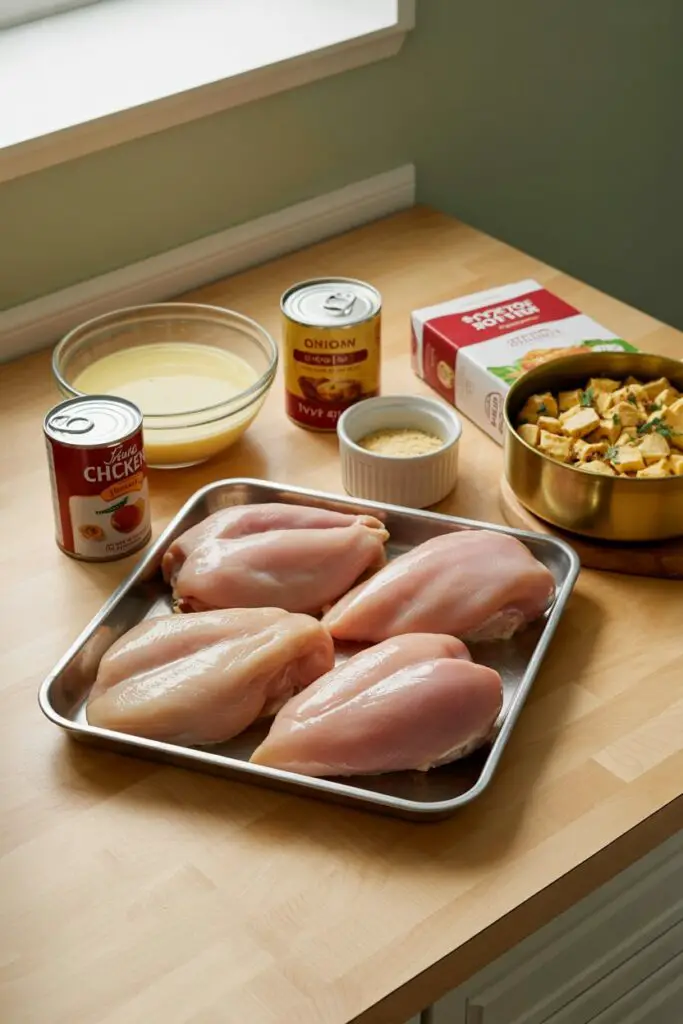 - Assemble the Base: Arrange the chicken breasts in a single layer in the dish. Spread the cream of chicken soup evenly over the top, then sprinkle the dry onion soup mix over the soup layer.