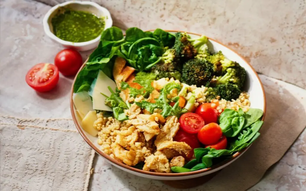 Once all the components are ready, it’s time to build your bowls. Begin by chopping or slicing the juicy roasted chicken. In four serving bowls, create a bed of fresh baby spinach. Layer the warm quinoa, spicy roasted broccoli, sliced chicken, and halved cherry tomatoes over the spinach. Finish by sprinkling each bowl with the shaved Parmesan cheese. Serve immediately, with the pesto vinaigrette drizzled over the top.