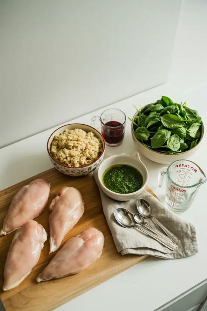 - Assemble Your Bowls: Let the chicken rest for a few minutes, then slice or chop it. Divide the fresh spinach among four serving bowls. Top with the warm quinoa, roasted broccoli, chicken, and cherry tomatoes. Sprinkle with shaved Parmesan and drizzle with the pesto vinaigrette before serving.